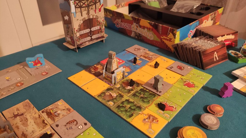 Wczoraj udało mi się rozłożyć najświeższy nabytek, czyli Queendomino. Pierwsza rozgrywka była tak naprawdę poznawaniem podstawowych zasad gry. Nowych graczy można wprowadzić dosłownie w minutę a o to właśnie mi chodziło. Na stole pojawiła się wieża z dodatku jako podajnik ale na potrzeby pierwszej gry nie wprowadzałam zasad z Ery Gigantów, którą głównie kupiłam ze względu na rozszerzenie dla piątego gracza.